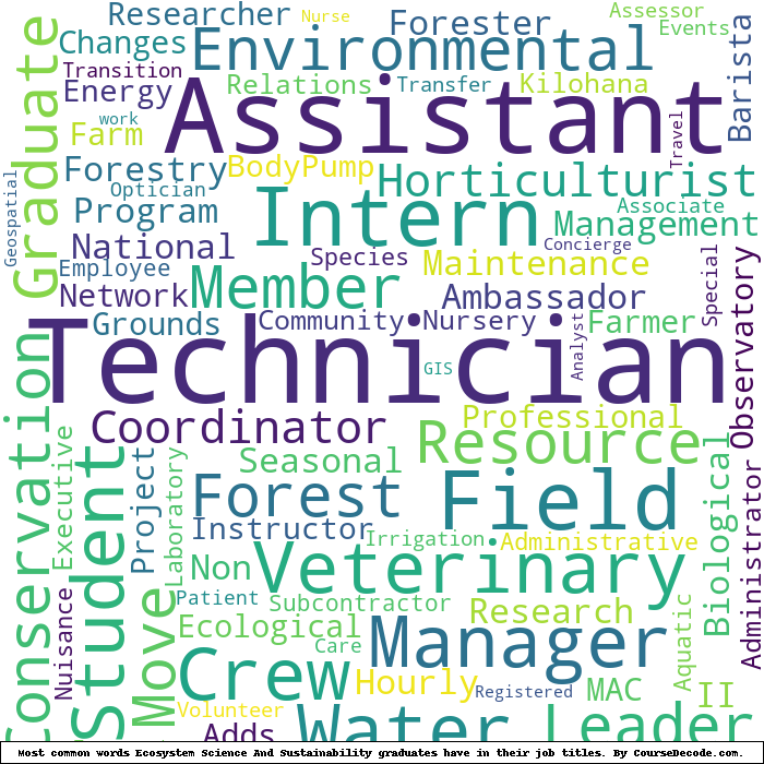 Here is a visual representation of the most common words in job titles for Ecosystem Science And Sustainability graduates (this is across all Ecosystem Science And Sustainability graduates we've analyzed, not just those who went to Colorado State University):