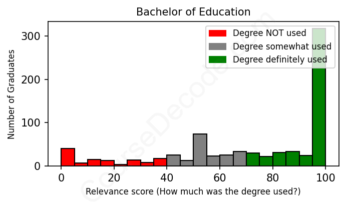 The verdict? Slightly above average. Overall, with an average relevance score of 72%, Education graduates have a slightly higher likelihood (+5%) of finding work in this field compared to the average graduate across all fields: