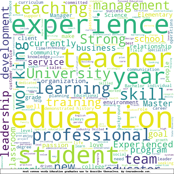 Here is a visual representation of the most common words seen in the "about" section of LinkedIn profiles who have a Bachelor degree in Education. This may or may not be useful: