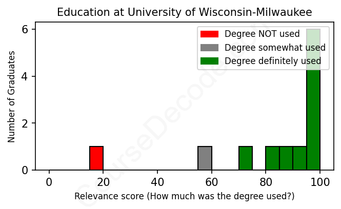 The verdict? Significantly above average. Overall, with an average relevance score of 83%, Education graduates from University of Wisconsin-Milwaukee have a much higher likelihood (+16%) of finding work in this field compared to the average graduate across all fields: