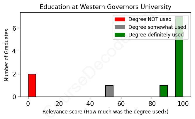 The verdict? Above average. Overall, with an average relevance score of 76%, Education graduates from Western Governors University have a higher likelihood (+9%) of finding work in this field compared to the average graduate across all fields: