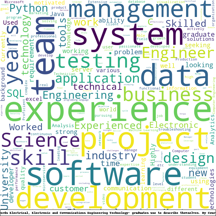 Here is a visual representation of the most common words seen in the "about" section of LinkedIn profiles who have a Bachelor degree in Electrical, Electronic and Communications Engineering Technology-. This may or may not be useful: