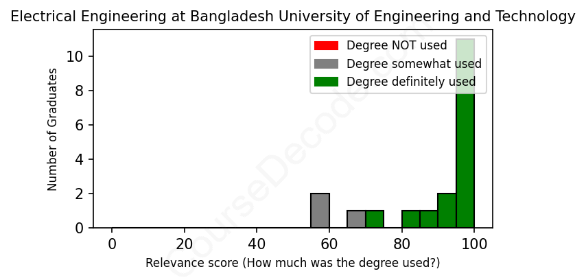 The verdict? Great! Overall, with an average relevance score of 89%, Electrical Engineering graduates from Bangladesh University of Engineering and Technology have a substantially higher likelihood (+22%) of finding work in this field compared to the average graduate across all fields: