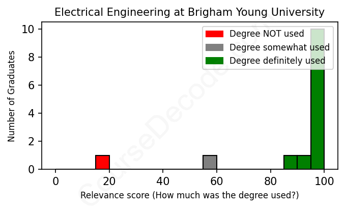 The verdict? Great! Overall, with an average relevance score of 89%, Electrical Engineering graduates from Brigham Young University have a substantially higher likelihood (+22%) of finding work in this field compared to the average graduate across all fields:
