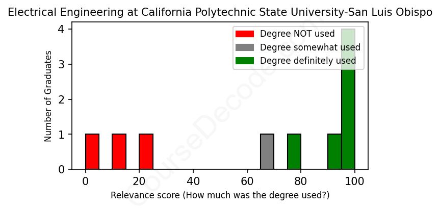 The verdict? On par with the average. Overall, with an average relevance score of 67%, Electrical Engineering graduates from California Polytechnic State University-San Luis Obispo have about the same likelihood of finding work in this field as the average graduate across all fields:
