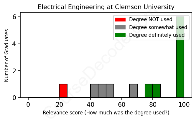 The verdict? Above average. Overall, with an average relevance score of 75%, Electrical Engineering graduates from Clemson University have a higher likelihood (+8%) of finding work in this field compared to the average graduate across all fields: