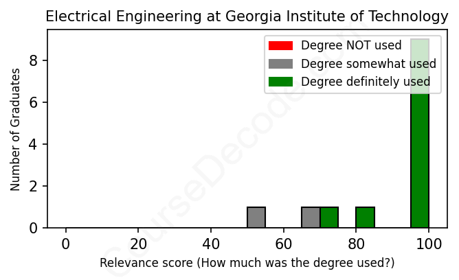 The verdict? Great! Overall, with an average relevance score of 89%, Electrical Engineering graduates from Georgia Institute of Technology have a substantially higher likelihood (+22%) of finding work in this field compared to the average graduate across all fields: