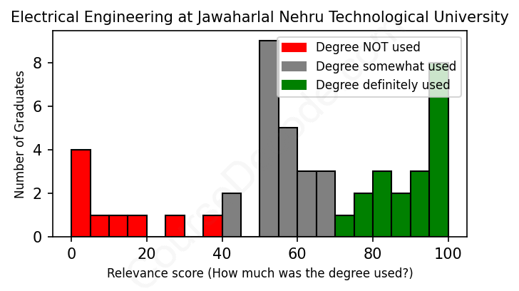 The verdict? Below average. Overall, with an average relevance score of 60%, Electrical Engineering graduates from Jawaharlal Nehru Technological University have a lower likelihood (-7%) of finding work in this field compared to the average graduate across all fields: