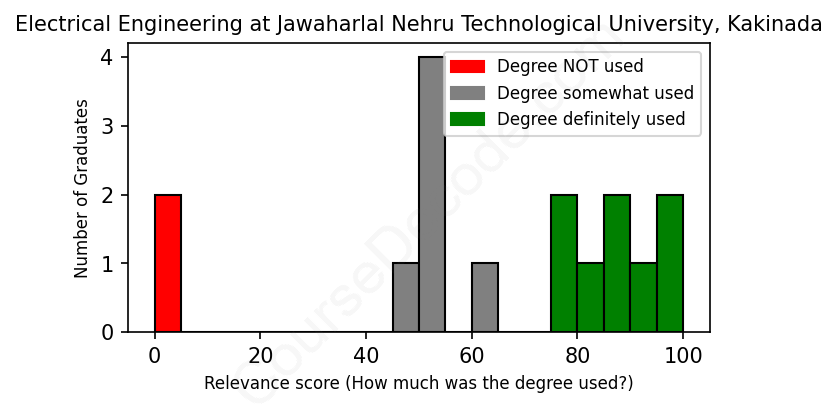 The verdict? Slightly below average. Overall, with an average relevance score of 63%, Electrical Engineering graduates from Jawaharlal Nehru Technological University, Kakinada have a slightly lower likelihood (-4%) of finding work in this field compared to the average graduate across all fields: