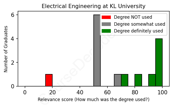 The verdict? Slightly above average. Overall, with an average relevance score of 68%, Electrical Engineering graduates from KL University have a slightly higher likelihood (+1%) of finding work in this field compared to the average graduate across all fields: