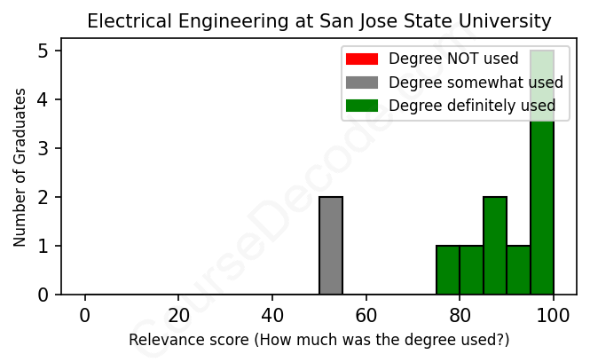 The verdict? Significantly above average. Overall, with an average relevance score of 85%, Electrical Engineering graduates from San Jose State University have a much higher likelihood (+18%) of finding work in this field compared to the average graduate across all fields: