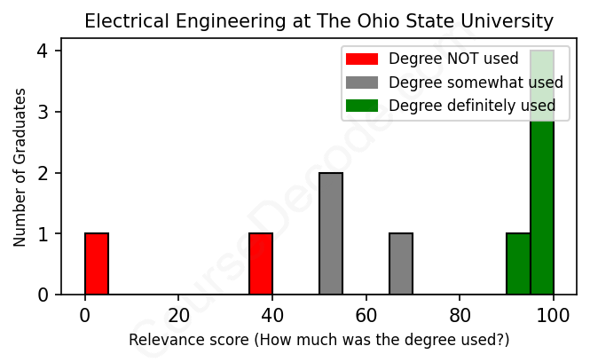The verdict? Slightly above average. Overall, with an average relevance score of 69%, Electrical Engineering graduates from The Ohio State University have a slightly higher likelihood (+2%) of finding work in this field compared to the average graduate across all fields: