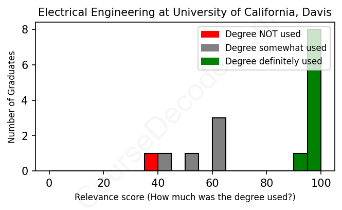 The verdict? Significantly above average. Overall, with an average relevance score of 80%, Electrical Engineering graduates from University of California, Davis have a much higher likelihood (+13%) of finding work in this field compared to the average graduate across all fields:
