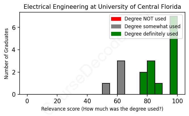 The verdict? Significantly above average. Overall, with an average relevance score of 83%, Electrical Engineering graduates from University of Central Florida have a much higher likelihood (+16%) of finding work in this field compared to the average graduate across all fields: