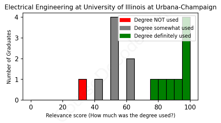 The verdict? Slightly above average. Overall, with an average relevance score of 71%, Electrical Engineering graduates from University of Illinois at Urbana-Champaign have a slightly higher likelihood (+4%) of finding work in this field compared to the average graduate across all fields:
