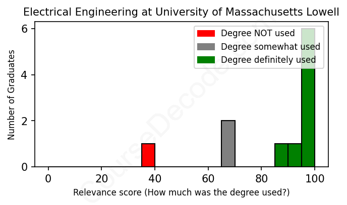 The verdict? Significantly above average. Overall, with an average relevance score of 86%, Electrical Engineering graduates from University of Massachusetts Lowell have a much higher likelihood (+19%) of finding work in this field compared to the average graduate across all fields: