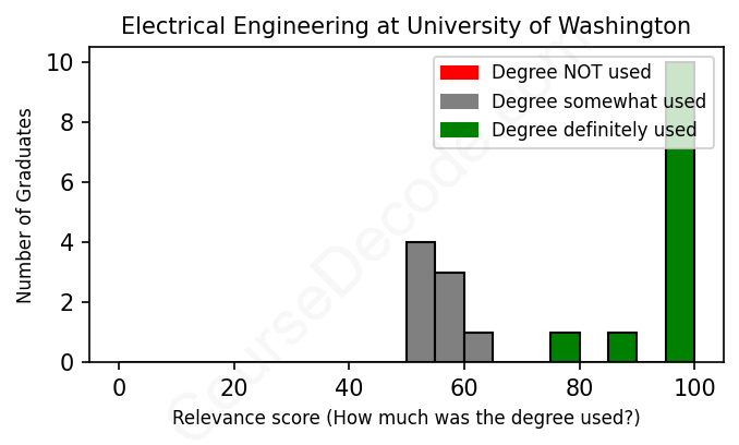 The verdict? Significantly above average. Overall, with an average relevance score of 79%, Electrical Engineering graduates from University of Washington have a much higher likelihood (+12%) of finding work in this field compared to the average graduate across all fields: