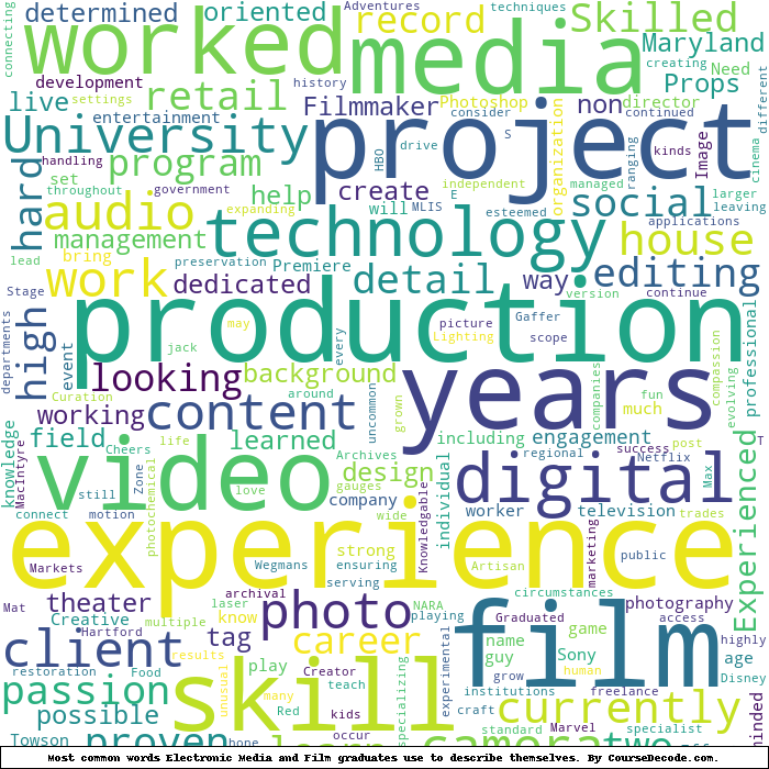 Here is a visual representation of the most common words seen in the "about" section of LinkedIn profiles who have a Bachelor degree in Electronic Media and Film (this is across all Electronic Media and Film graduates we've analyzed, not just those who went to Towson University). This may or may not be useful: