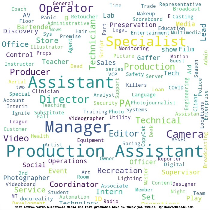 Here is a visual representation of the most common words in job titles for Electronic Media and Film graduates (this is across all Electronic Media and Film graduates we've analyzed, not just those who went to Towson University):