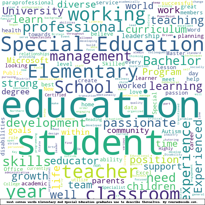Here is a visual representation of the most common words seen in the "about" section of LinkedIn profiles who have a Bachelor degree in Elementary And Special Education. This may or may not be useful: