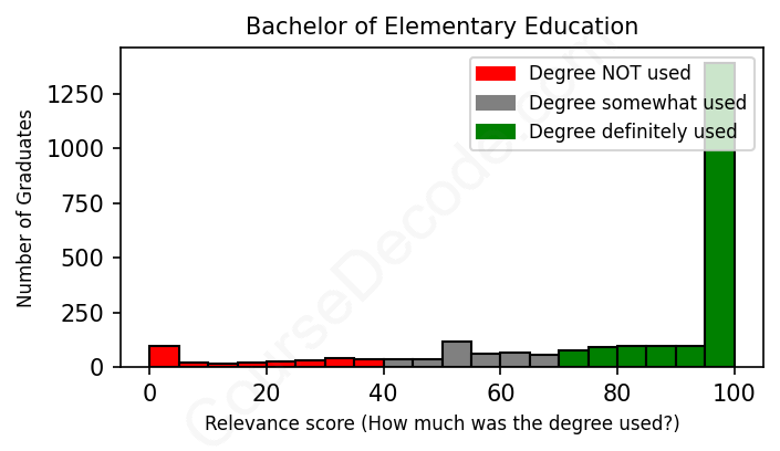 The verdict? Significantly above average. Overall, with an average relevance score of 80%, Elementary Education graduates have a much higher likelihood (+13%) of finding work in this field compared to the average graduate across all fields: