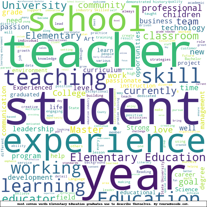 Here is a visual representation of the most common words seen in the "about" section of LinkedIn profiles who have a Bachelor degree in Elementary Education. This may or may not be useful: