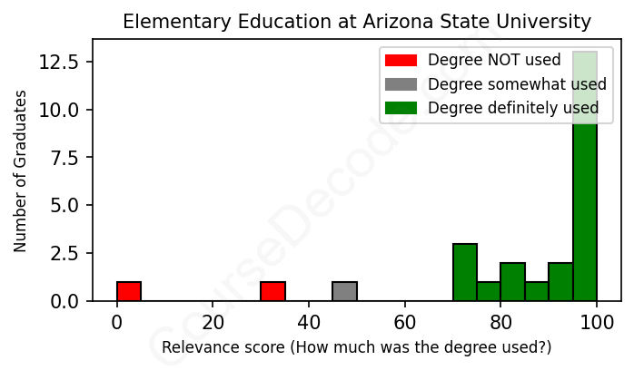 The verdict? Significantly above average. Overall, with an average relevance score of 83%, Elementary Education graduates from Arizona State University have a much higher likelihood (+16%) of finding work in this field compared to the average graduate across all fields:
