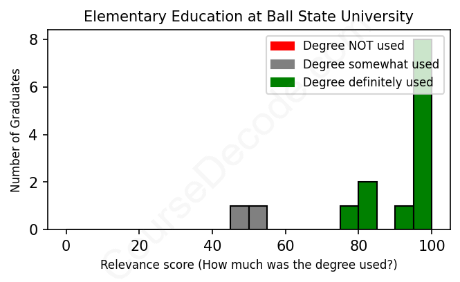 The verdict? Great! Overall, with an average relevance score of 88%, Elementary Education graduates from Ball State University have a substantially higher likelihood (+21%) of finding work in this field compared to the average graduate across all fields: