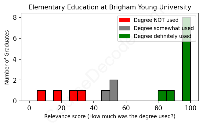 The verdict? Slightly above average. Overall, with an average relevance score of 70%, Elementary Education graduates from Brigham Young University have a slightly higher likelihood (+3%) of finding work in this field compared to the average graduate across all fields: