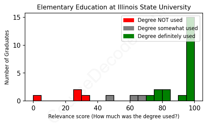 The verdict? Significantly above average. Overall, with an average relevance score of 80%, Elementary Education graduates from Illinois State University have a much higher likelihood (+13%) of finding work in this field compared to the average graduate across all fields:
