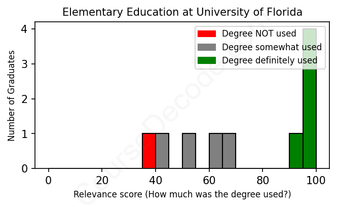 The verdict? Above average. Overall, with an average relevance score of 75%, Elementary Education graduates from University of Florida have a higher likelihood (+8%) of finding work in this field compared to the average graduate across all fields: