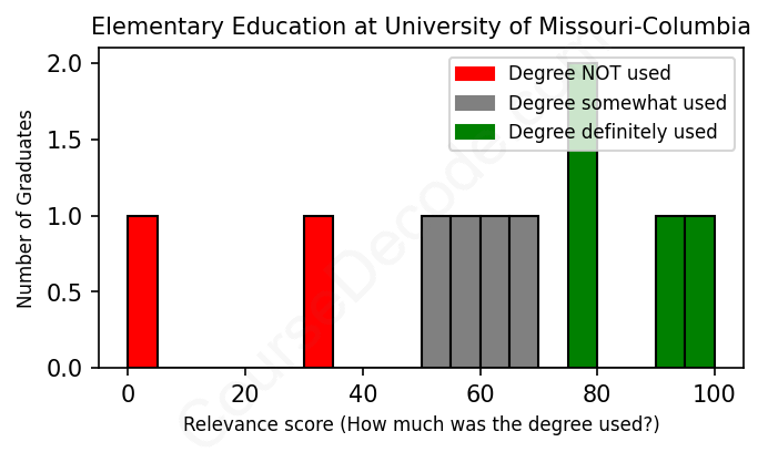 The verdict? Slightly below average. Overall, with an average relevance score of 62%, Elementary Education graduates from University of Missouri-Columbia have a slightly lower likelihood (-5%) of finding work in this field compared to the average graduate across all fields: