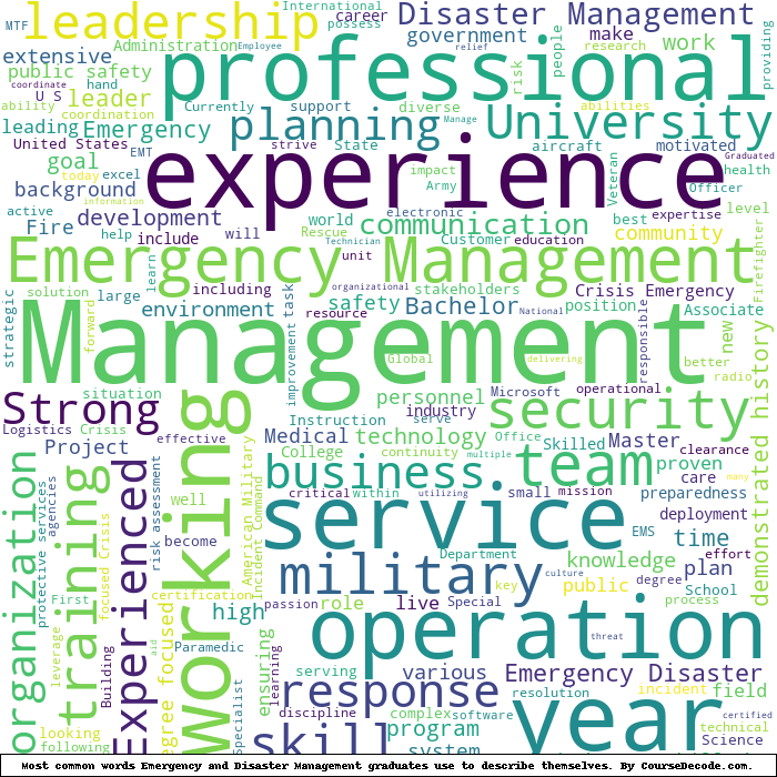 Here is a visual representation of the most common words seen in the "about" section of LinkedIn profiles who have a Bachelor degree in Emergency and Disaster Management. This may or may not be useful:
