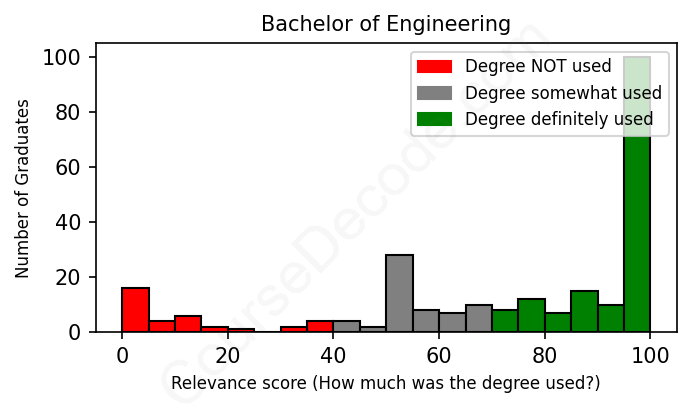 The verdict? Slightly above average. Overall, with an average relevance score of 72%, Engineering graduates have a slightly higher likelihood (+5%) of finding work in this field compared to the average graduate across all fields: