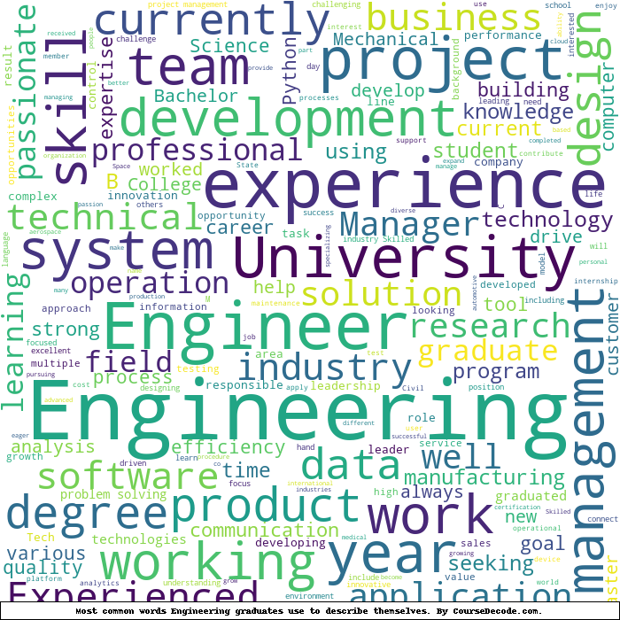 Here is a visual representation of the most common words seen in the "about" section of LinkedIn profiles who have a Bachelor degree in Engineering. This may or may not be useful: