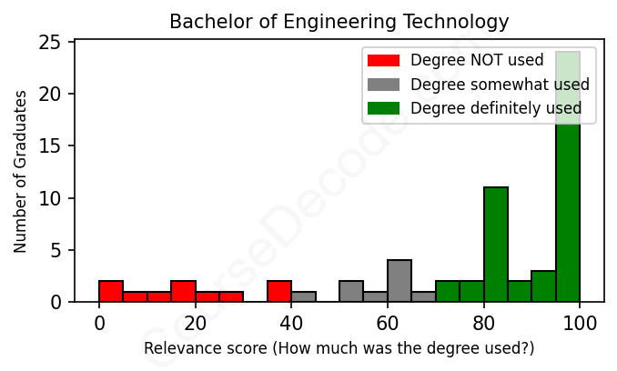 Overall, while many graduates are securing jobs that closely relate to their Engineering Technology background, a significant number are ending up in positions that, although they may utilize some transferable skills, do not leverage the technical and engineering expertise that their degree provides. This suggests that while the degree opens doors to a range of engineering-related jobs, a good portion of graduates may find themselves in roles that stray from the technical applications of their studies, emphasizing the importance of aligning career choices with their educational foundation for the best utilization of their qualifications.