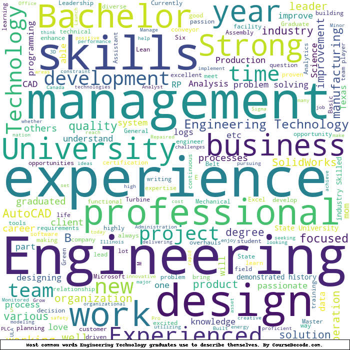 Here is a visual representation of the most common words seen in the "about" section of LinkedIn profiles who have a Bachelor degree in Engineering Technology. This may or may not be useful: