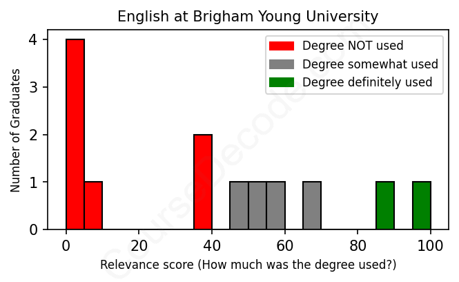 The verdict? Bad. Overall, with an average relevance score of 38%, English graduates from Brigham Young University have a substantially lower likelihood (-29%) of finding work in this field compared to the average graduate across all fields:
