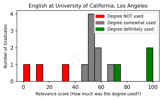 The verdict? Significantly below average. Overall, with an average relevance score of 53%, English graduates from University of California, Los Angeles have a much lower likelihood (-14%) of finding work in this field compared to the average graduate across all fields: