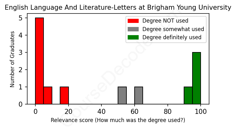 The verdict? Bad. Overall, with an average relevance score of 40%, English Language And Literature-Letters graduates from Brigham Young University have a substantially lower likelihood (-27%) of finding work in this field compared to the average graduate across all fields: