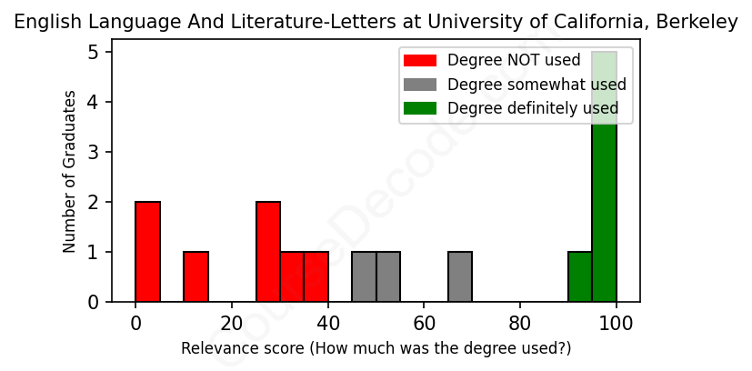 The verdict? Significantly below average. Overall, with an average relevance score of 55%, English Language And Literature-Letters graduates from University of California, Berkeley have a much lower likelihood (-12%) of finding work in this field compared to the average graduate across all fields: