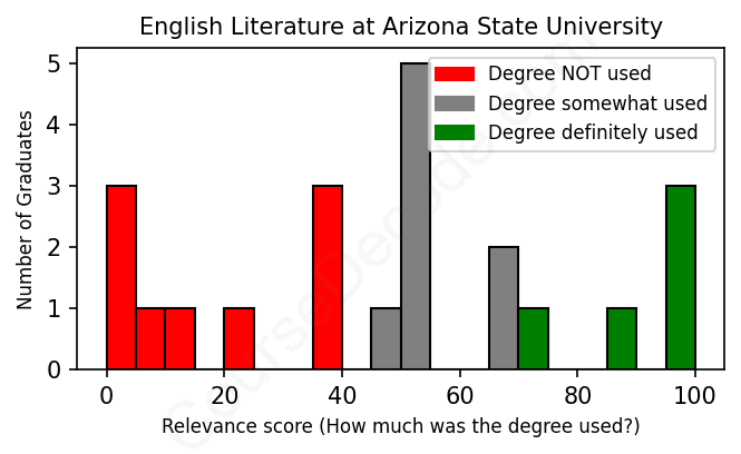 The verdict? Significantly below average. Overall, with an average relevance score of 48%, English Literature graduates from Arizona State University have a much lower likelihood (-19%) of finding work in this field compared to the average graduate across all fields: