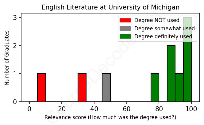 The verdict? Slightly above average. Overall, with an average relevance score of 72%, English Literature graduates from University of Michigan have a slightly higher likelihood (+5%) of finding work in this field compared to the average graduate across all fields: