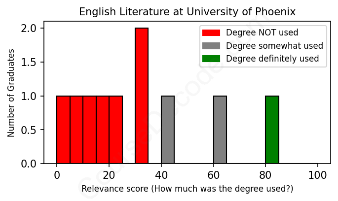 The verdict? Horrible! Overall, with an average relevance score of 31%, English Literature graduates from University of Phoenix have an exceptionally lower likelihood (-36%) of finding work in this field compared to the average graduate across all fields: