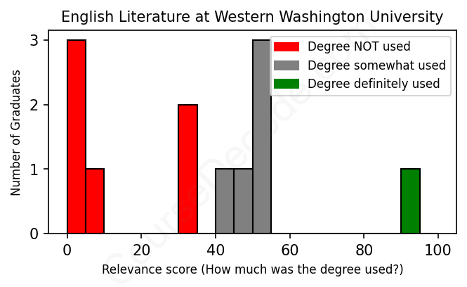 The verdict? Horrible! Overall, with an average relevance score of 34%, English Literature graduates from Western Washington University have an exceptionally lower likelihood (-33%) of finding work in this field compared to the average graduate across all fields: