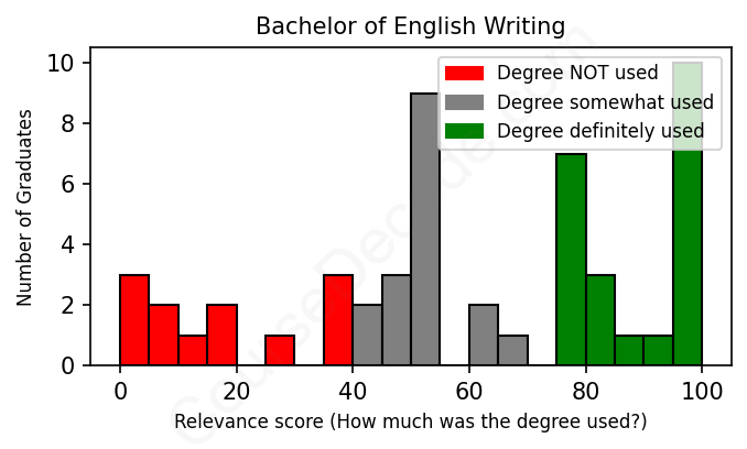 The verdict? Below average. Overall, with an average relevance score of 61%, English Writing graduates have a lower likelihood (-6%) of finding work in this field compared to the average graduate across all fields: