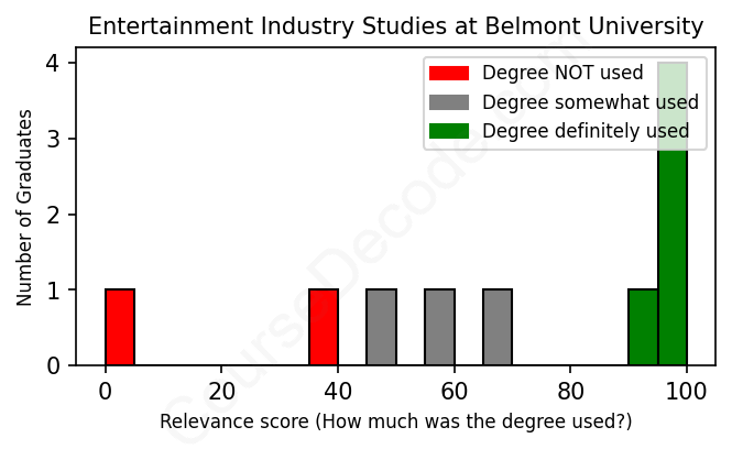 The verdict? Slightly above average. Overall, with an average relevance score of 69%, Entertainment Industry Studies graduates from Belmont University have a slightly higher likelihood (+2%) of finding work in this field compared to the average graduate across all fields: