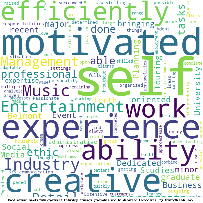 Here is a visual representation of the most common words seen in the "about" section of LinkedIn profiles who have a Bachelor degree in Entertainment Industry Studies (this is across all Entertainment Industry Studies graduates we've analyzed, not just those who went to Belmont University). This may or may not be useful: