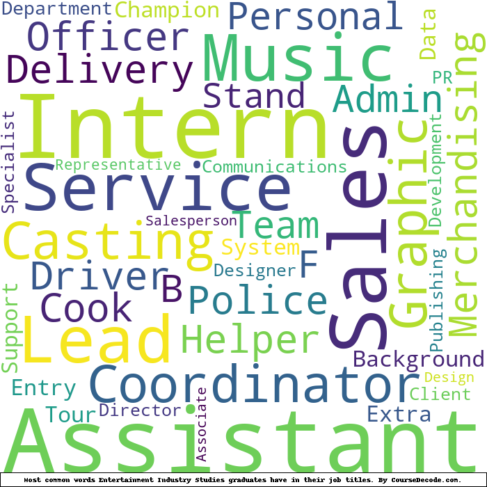 Here is a visual representation of the most common words in job titles for Entertainment Industry Studies graduates (this is across all Entertainment Industry Studies graduates we've analyzed, not just those who went to Belmont University):