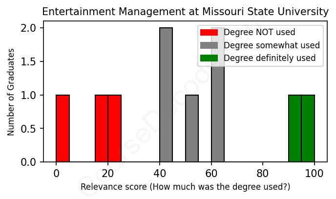 First, some facts. Of the Entertainment Management graduates from Missouri State University we've analyzed , here's how many have used (or NOT used) their degree in their career: